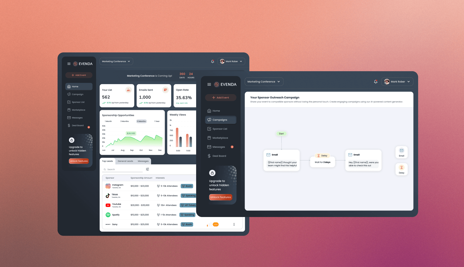 Evenda saves you time and money by using proprietary data to match events to interested sponsors. Simplify sponsor outreach, negotiate terms, and collect payment with one easy to use application.